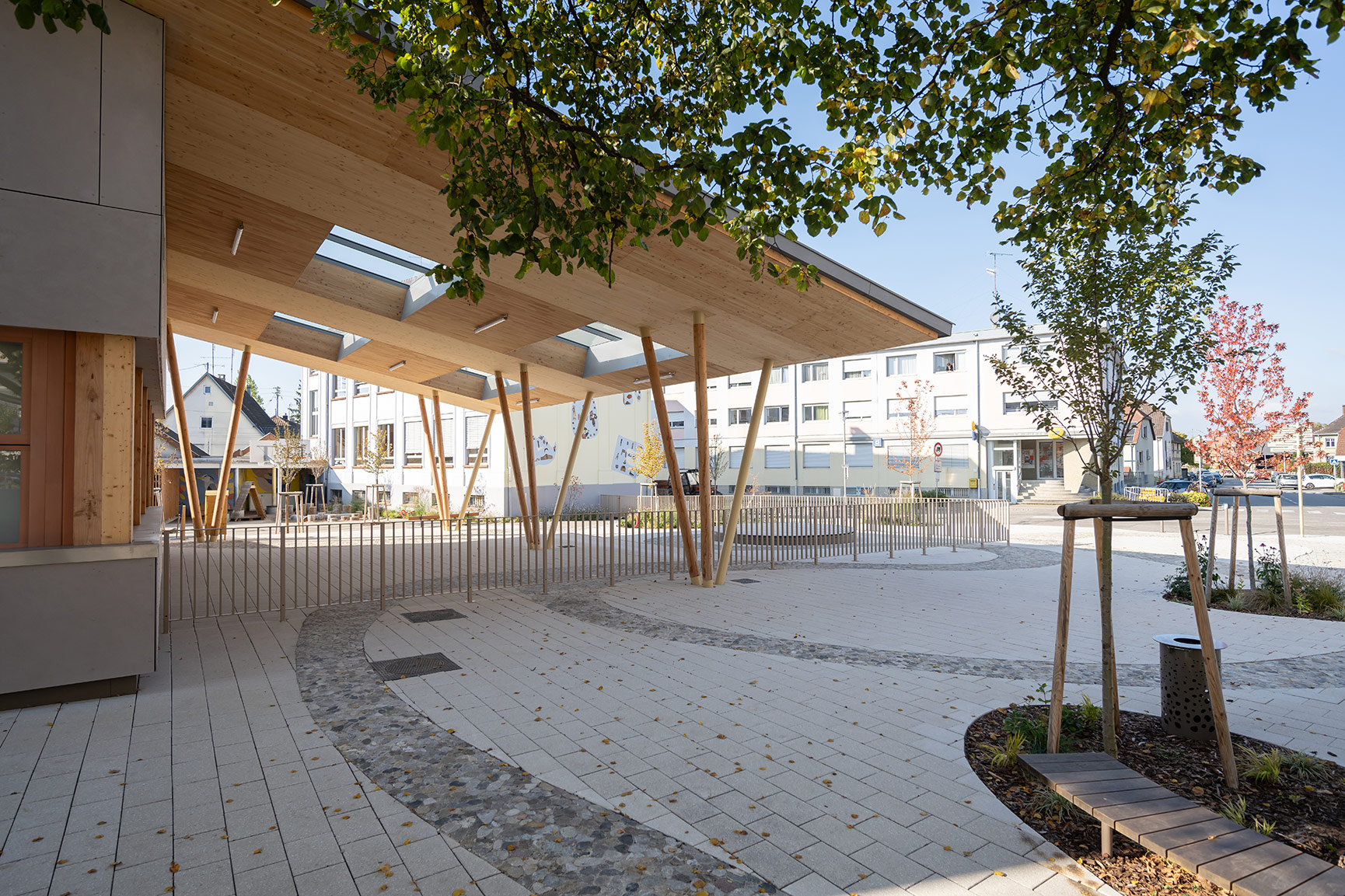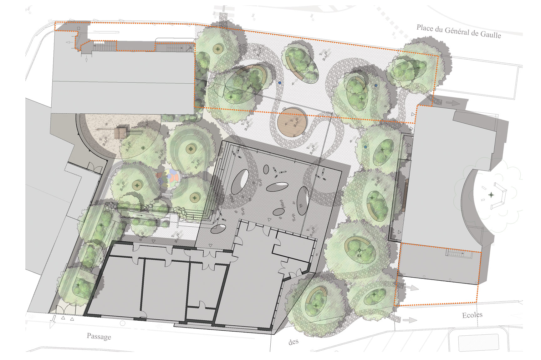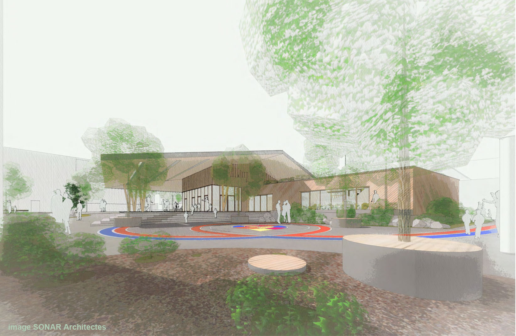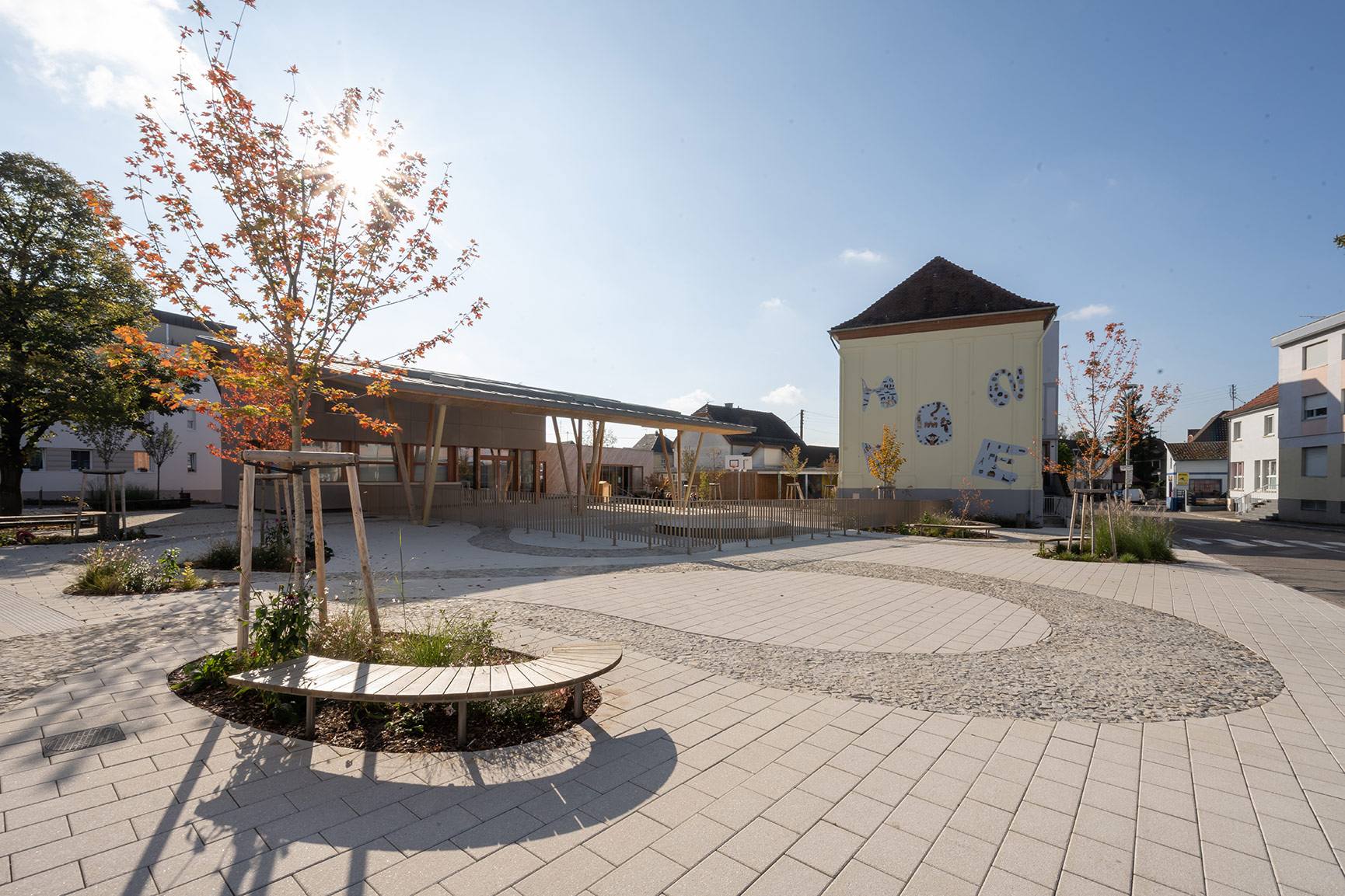 Construction d’un bâtiment sur le site de l’école élémentaire. Aménagement de la cour d’école et création d’une place de village. Maîtrise d’ouvrage : Commune d’Illfurth (68) Sonar Architectes mandataires Superficie : 1600 m2 Budget aménagements extérieurs : 419 800€ HT Livraison 2025